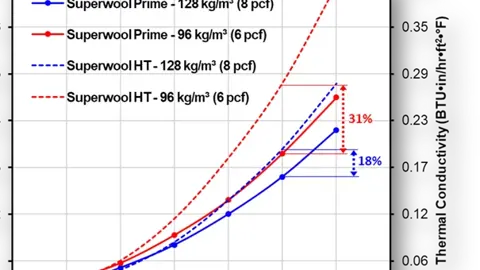 Compared to Superwool HT, the thermal conductivity of Superwool Prime Blanket at 1000°C (1832°F) for 128kg/m3 (8pcf) density is 18% better.